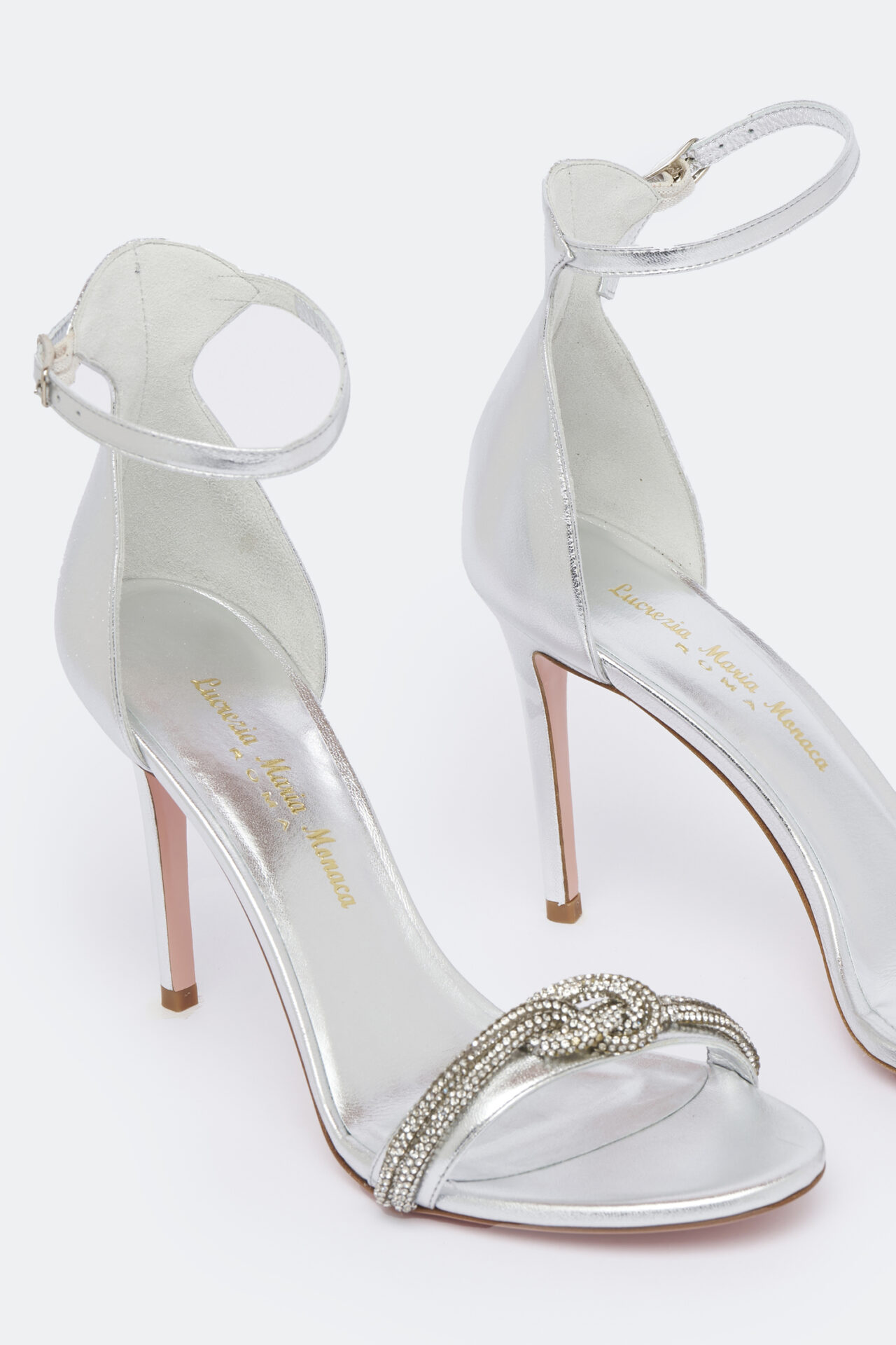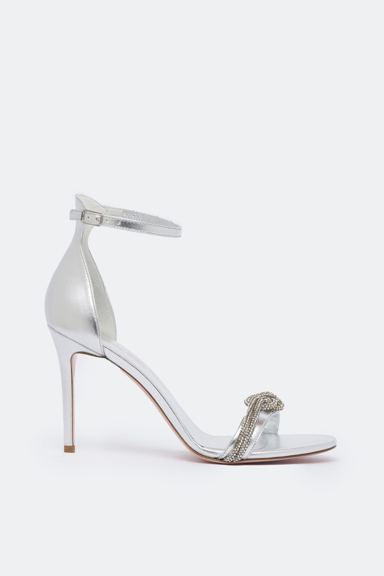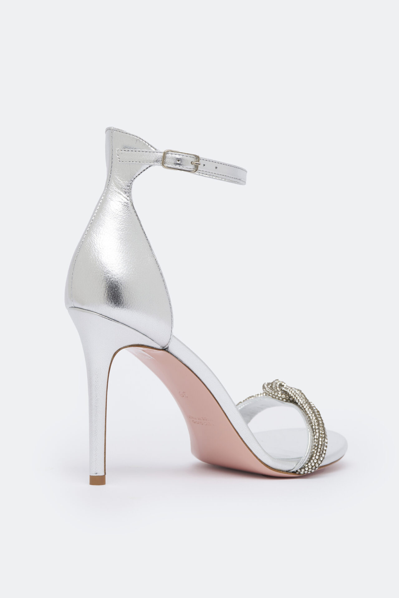 Sandal in silver leather with rhinestones. 95 mm heel.