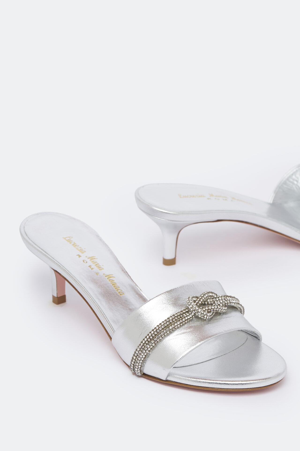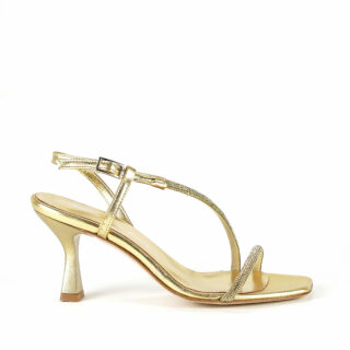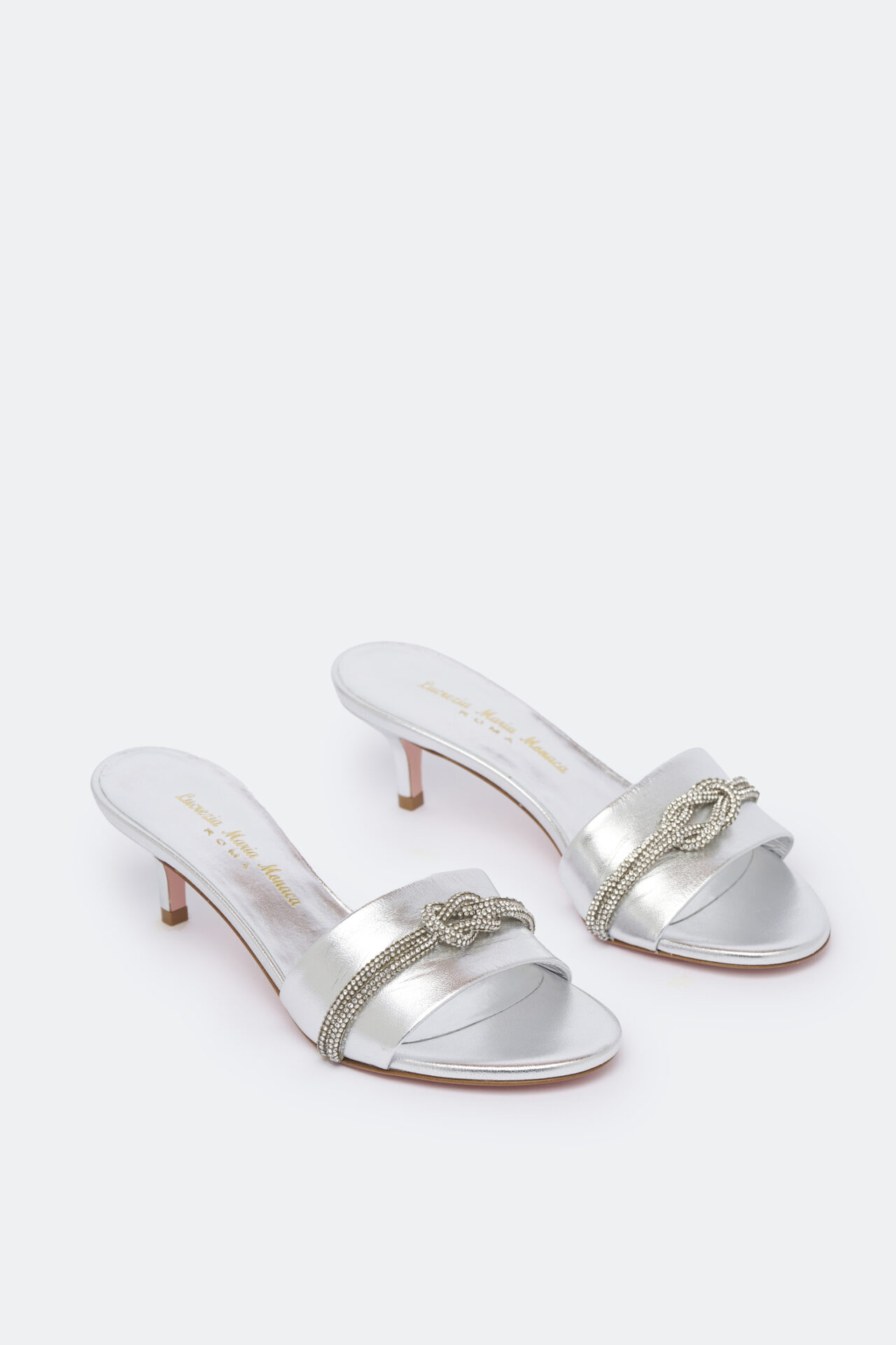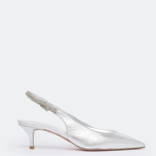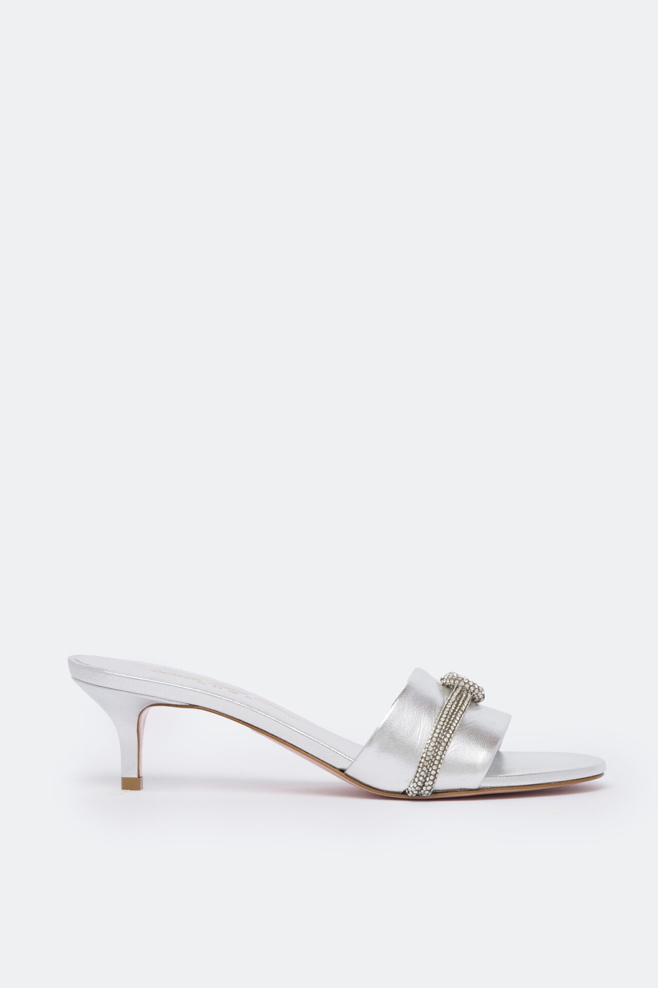 Sandal in silver leather with rhinestones. 50 mm heel.