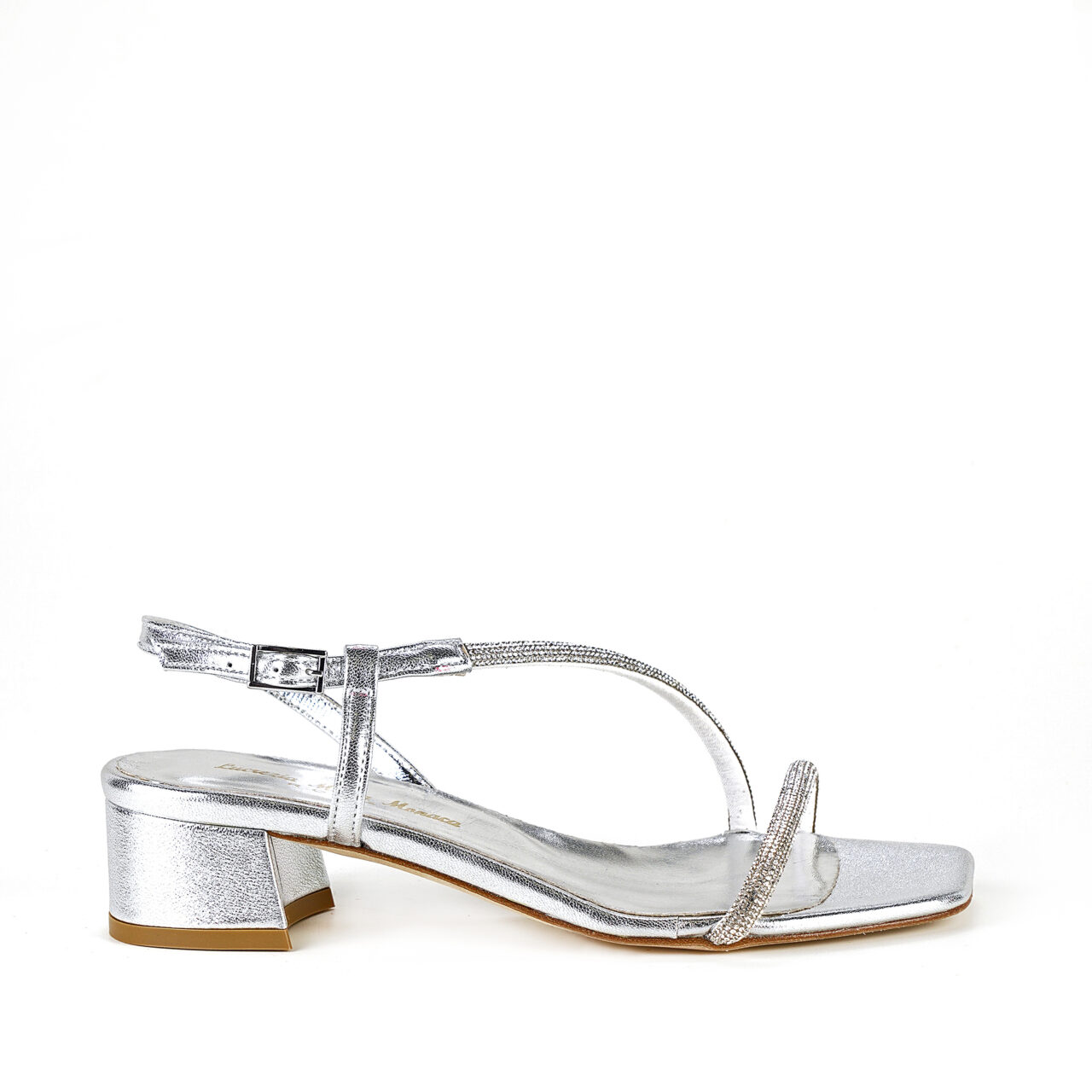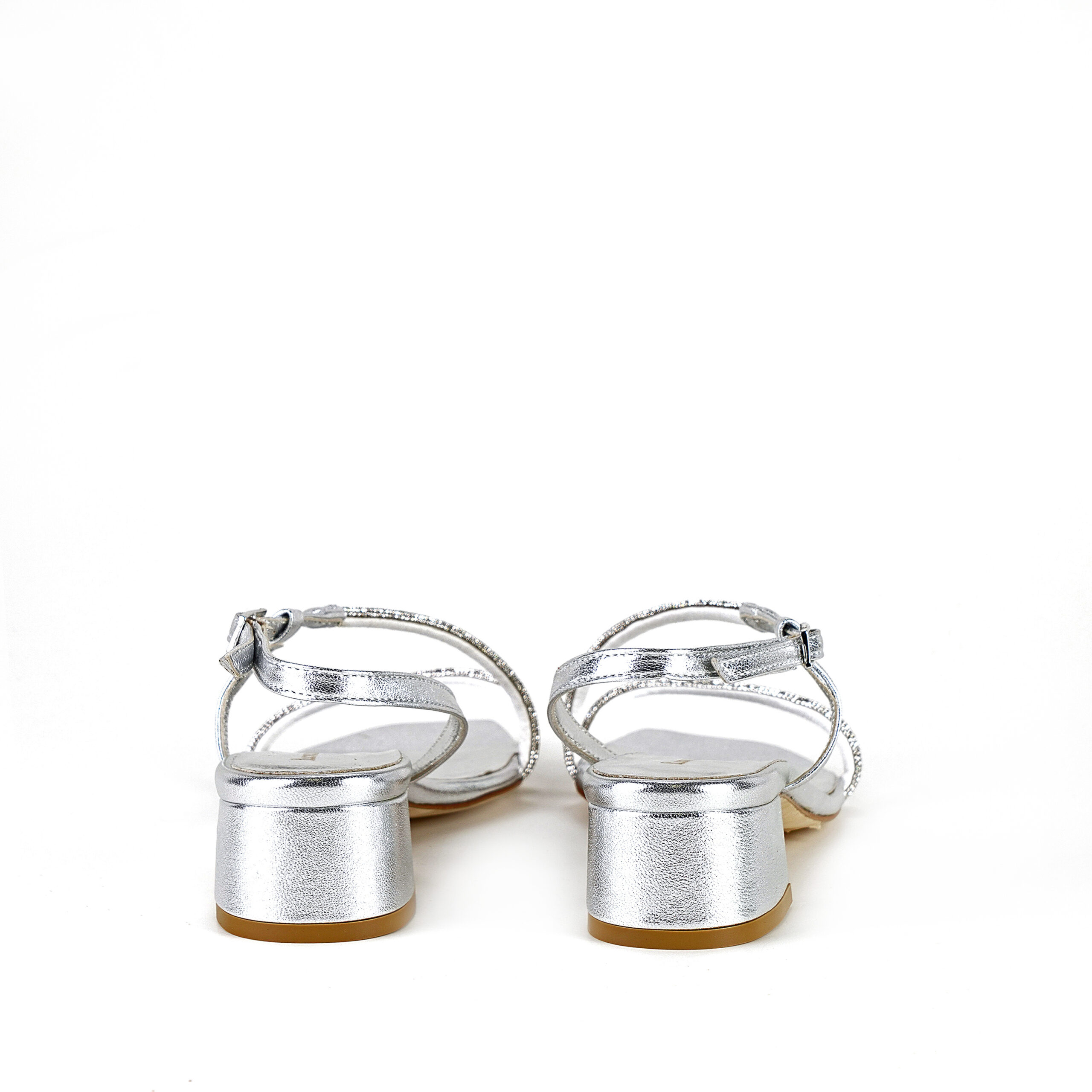 Sandal in silver leather with rhinestones. 30 mm heel.